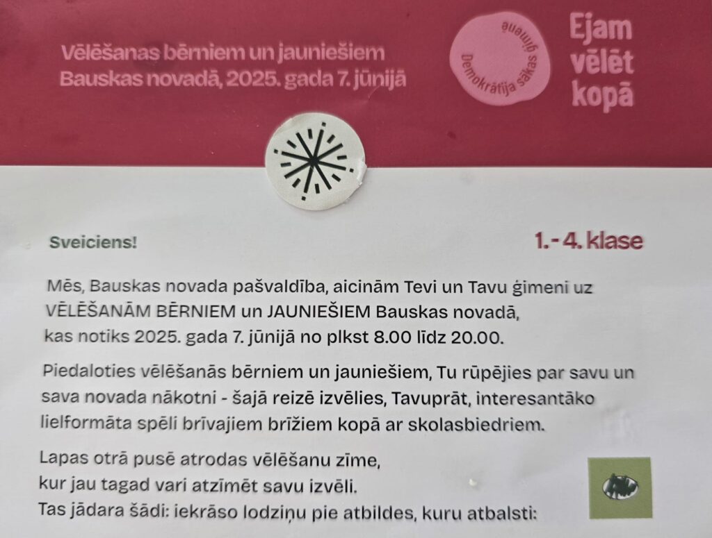Pašiem jaunākajiem Bauskas novada pilsoņiem, sākot no pusotra gada līdz skolas vecumam, būs iespēja izvēlēties vienu no diviem atstarotāju veidiem un balsot par sev tīkamāko drošības elementu. Pēc vēlēšanās izdarītās izvēles pašvaldība iegādāsies atstarotājus un rudenī tos nodos izglītības iestādēm izdalīšanai jaunajiem vēlētājiem.