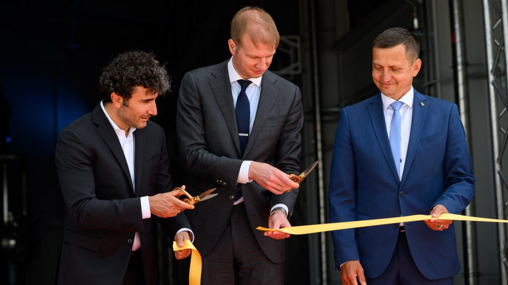 Klātesot “Balticovo” vadītājam Vladimiram Mhitarjanam ( no kreisās), klimata un enerģētikas ministram Kasparam Melnim (vidū), Zemkopības ministram Armandam Krauzem un vēl 100 viesiem Iecavas pagastā oficiāli atklāta biogāzes attīrīšanas un biometāna ražošanas rūpnīca “Bovogas”. Foto: Publicitātes foto