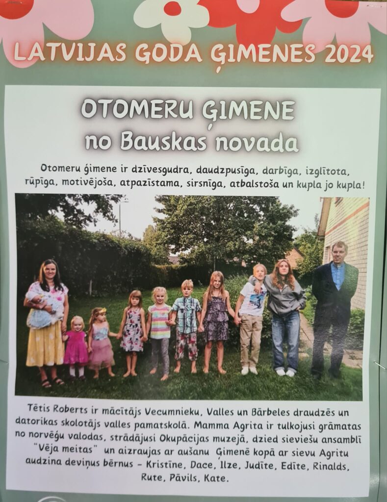 No Bauskas novada tika izvirzītas divas saimes- Otomeru un Lukjanoviču ģimene. 37 pašvaldību pieteiktās ģimenes vērtēja Latvijas Apvienības sastāvā esošo astoņu daudzbērnu ģimeņu biedrību vadītāji. Trešdien, 1. maijā, Rīgas Nacionālajā Zooloģiskajā dārzā norisinājās Daudzbērnu ģimeņu festivāls, kur tika godinātas konkursa “Latvijas Goda ģimene 2024” laureātu ģimenes. Konkursā par uzvarētāju tika atzīta Otomeru ģimene no Vecumniekiem.