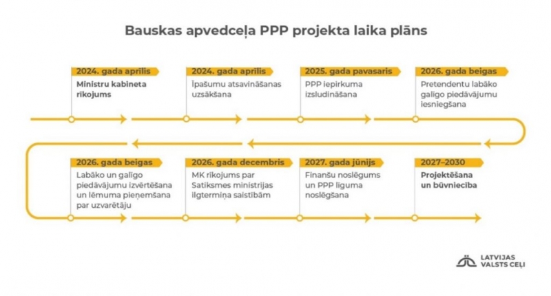 Bauskas apvedceļa projektu īstenos pēc modeļa “projektē-būvē-finansē-uzturi”. Tas nozīmē, ka publiskā iepirkumā izraudzītais uzņēmējs pats piesaistīs naudu projektēšanai un būvdarbiem. Privāto partneri plānots izraudzīties līdz 2027. gada beigām.