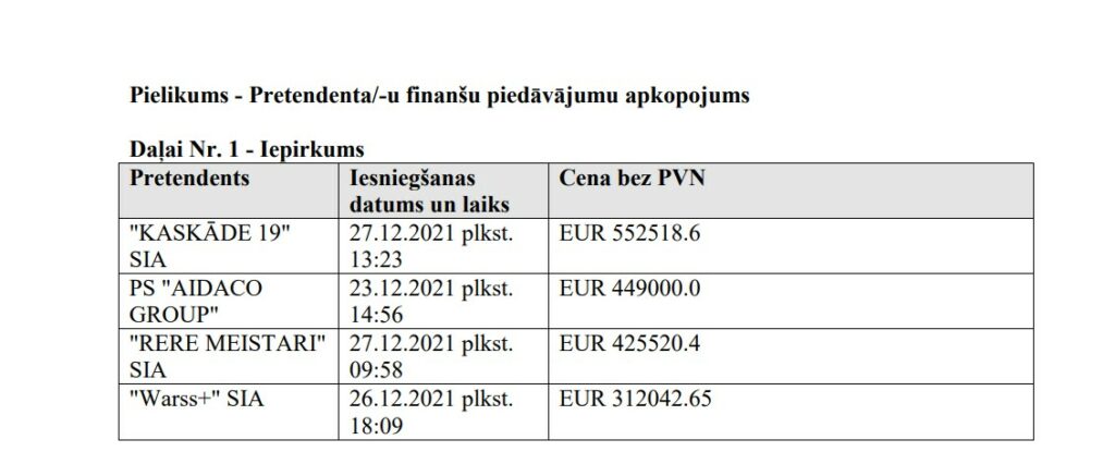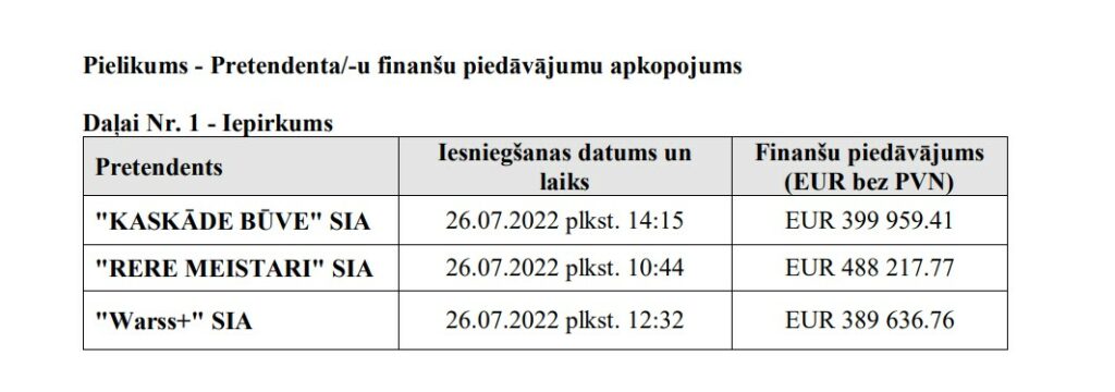 Iepirkumā piedāvājumus bija iesnieguši četri pretendenti. Bauskas novada uzņēmums SIA “Kaskāde 19” piedāvāja visaugstāko cenu – 552 518,60 eiro bez PVN – un 60 mēnešu garantiju. Pilnsabiedrības “Aidaco Group” piedāvājums bija 449 000 eiro, SIA “RERE Meistari” aprēķinātā summa bija 425 520,40 eiro, bet vislētāko cenu sagatavoja SIA “Warss+” – 312 042, 65 eiro (visas summas norādītas bez PVN). Visiem uzņēmumiem piedāvātais garantijas periods noteikts 84 mēneši. Par saimnieciski izdevīgāko iepirkumu komisija atzina SIA “Warss+” piedāvājumu.