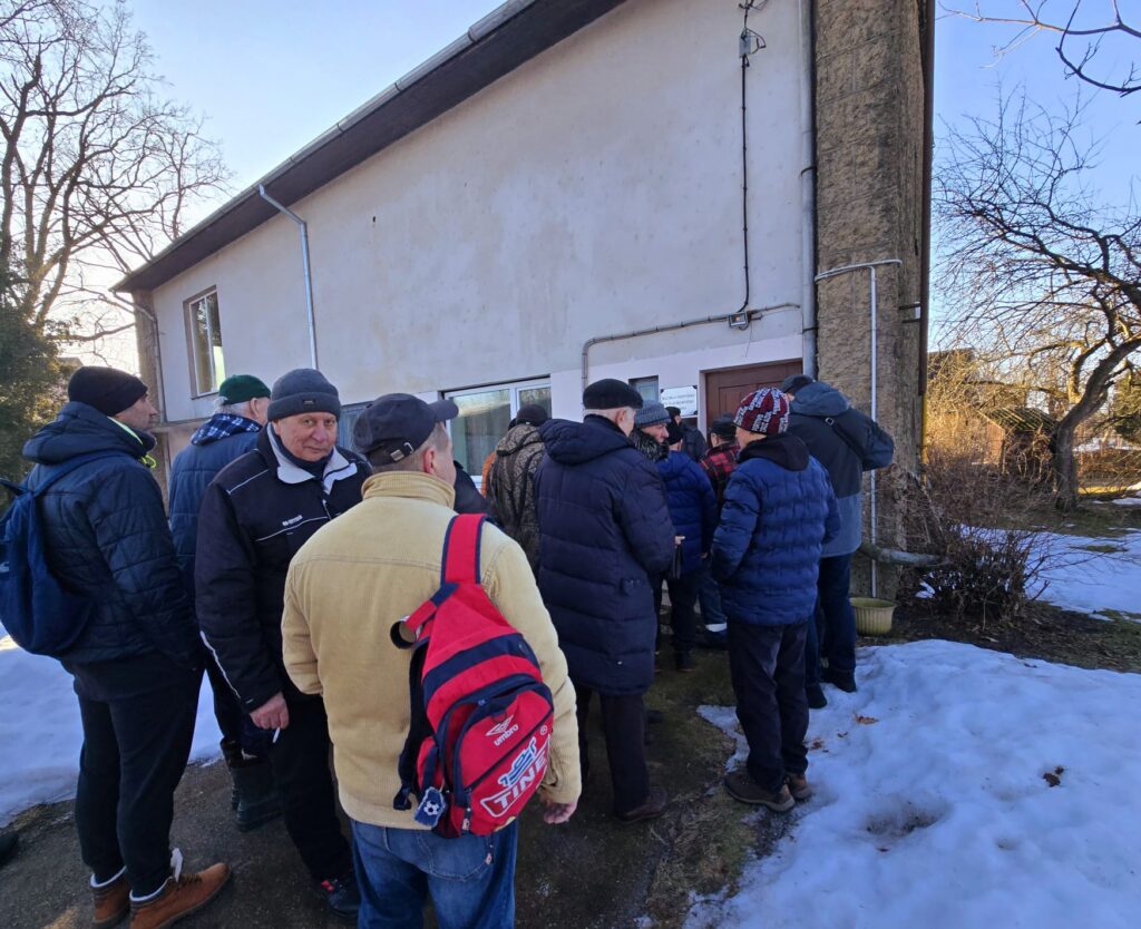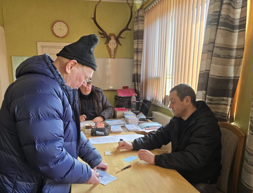 Baušķenieks Jons Svetiņins (no kreisās) 7. martā iegādājās sezonas licenci B zonai. Viņam atļauju noformēja Bauskas Mednieku un makšķernieku biedrības pārstāvis Aleksandrs Gurkovskis.