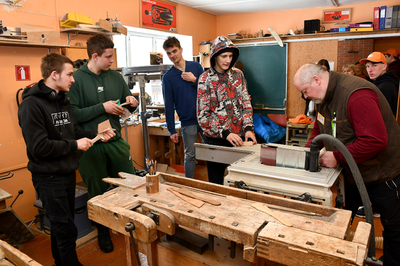 Sabraukušie skolēni tika sadalīti grupās, lai rotācijas veidā izietu dažādas nodarbību stacijas. Skaistkalnes vidusskolas puiši izzinošo dienu sāka ar speķa pīrāgu cepšanu, ko vadīja skolotāja Ilze Červinska, un paši atzina, ka šī nodarbe viņiem labi iet pie sirds. Virtuvē virmoja mīklas aromāts un siltumu izstaroja krāsns, līdz ar «Bauskas Dzīves» ienākšanu plītī tika iešauta pirmā raušu panna. Kamēr pīrāgi cepas, apakšstāvā Iecavas pamatskolas puiši skolotāja Jura Bidzāna vadībā gatavoja koka karotes. Sākumā tiek paņemts dēlis, uz kura uzzīmē vēlamo karotes formu, tad ar figūrzāģi tiek iegūta forma, bet ilgāko laiku prasa «pucēšanas» darbi – pulēšana, slīpēšana un gatavā produkta ieeļļošana.