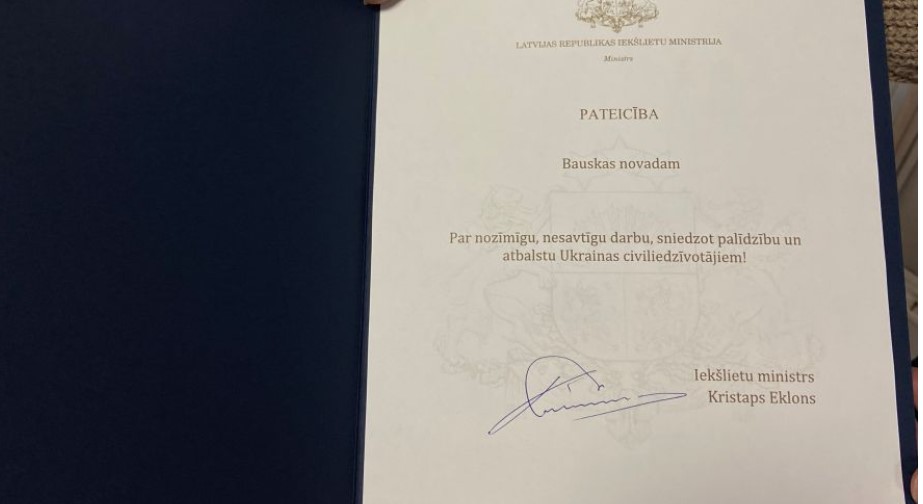 Šobrīd Bauskas novadā mīt aptuveni 450 Ukrainas civiliedzīvotāju. Aptuveni 80% no tiem dzīvo pie privātpersonām, pārējie – Saulainē kopmītnēs un Īslīces SOS bērnu ciematā. 7.novembrī Bauskas novadam tika pasniegta Iekšlietu ministrijas pateicība par nozīmīgu, nesavtīgu darbu, sniedzot palīdzību un atbalstu Ukrainas civiliedzīvotājiem, uzsver pašvaldībā.
