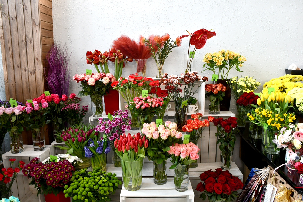 Salona pamatsortimentu, kā ierasts, veido labi zināmā puķu klasika: rozes, krizantēmas, neļķes, lilijas, frēzijas. Tām uz laiku pievienojas sezonālais piedāvājums. Tagad pavasarī tās ir tulpes, narcises, hiacintes, grieztas un podiņos, muskares podiņos, dažādu krāsu amariļļi, anemones, ranunkuļi jeb Āzijas gundegas. Rudenī lielziedu krizantēmas, mārtiņrozes.