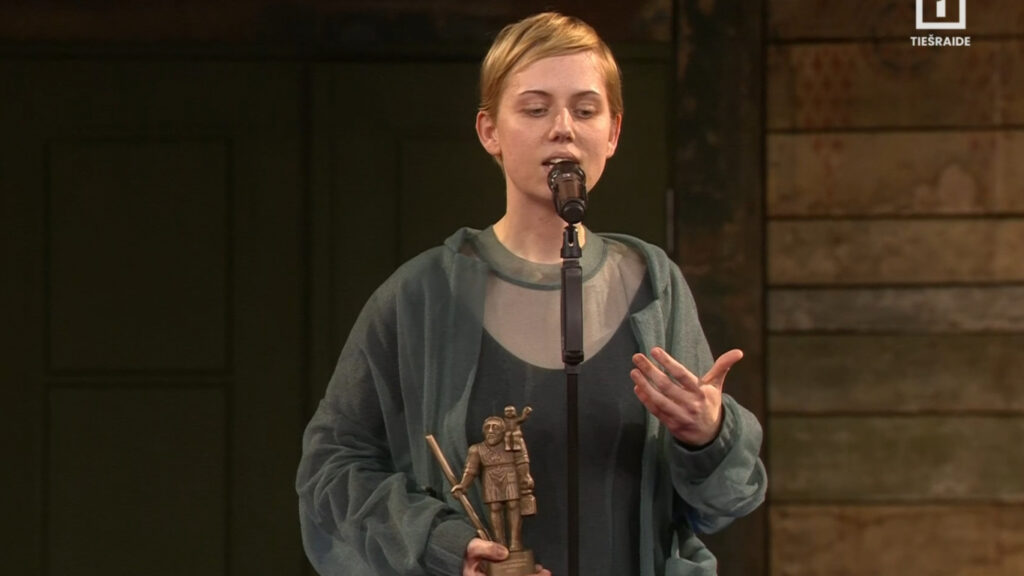 Marija Luīze Meļķe ar nacionālo kino balvu “Lielais Kristaps” – par Laines lomas atveidojumu filmā “Neona pavasaris”. Attēls – ekrānuzņēmums no LTV1.