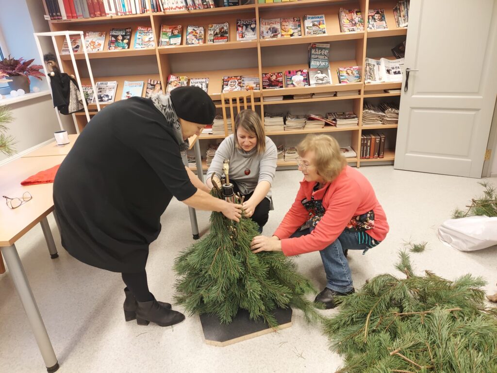 Atpūtas centra «Labirinti» saimniece Dzintra Pastare un bijusī bibliotekāre Aina Ezergaile pirmdien uz bibliotēku atvedušas egļu un priežu zarus, kā arī citus dekoru elementus, lai kopīgi izveidotu rūķa figūru, adventes vainagu un kompozīcijas, ko izlikt pie bibliotēkas un telpās.