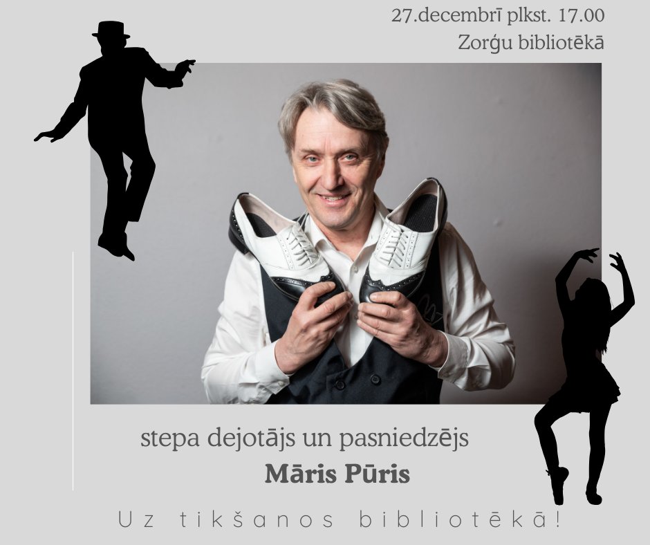 Zorģu bibliotēka 27. decembrī pulksten 17 aicina uz tikšanos ar stepa dejotāju, pedagogu un aktieri Māri Pūri, informē bibliotekāre Dace Frinda.